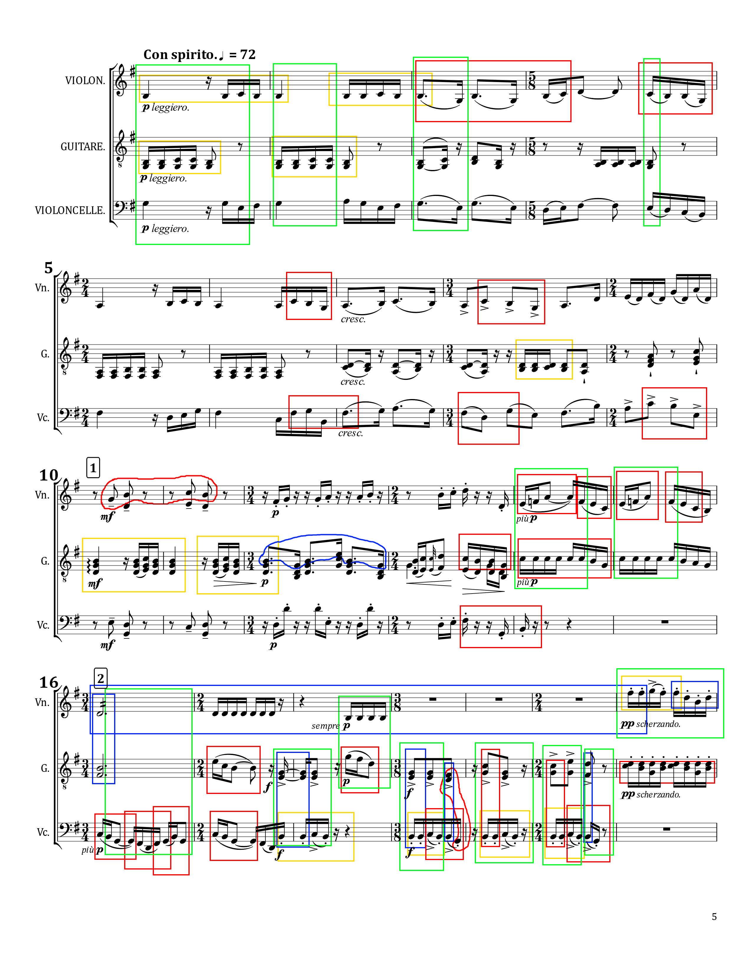 Il est facile de débusquer toutes les apparitions de ces trois cellules, ou sonorités dans la partition. Voici une démonstration de toutes les utilisations des motifs dans la première page du Con spirito, après « C’ÉTAIT CHARMANT! » (motif « Ne me quitte pas » en jaune, « de l’homme » en rouge, « de la Narratrice » en bleu, et l’union des deux en vert) :